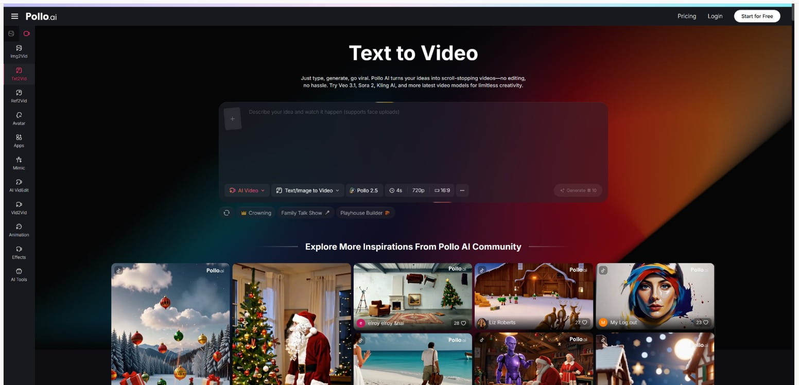 One platform that has gained traction in this space is Pollo AI. Its text to video feature allows users to type a detailed prompt and receive a polished video output without any filming or editing experience. The interface is designed to be intuitive, so even first-time users can go from idea to finished clip in just a few steps. What sets Pollo AI apart is the balance between ease of use and output quality — the generated videos feature natural motion, coherent lighting, and visually appealing compositions that feel ready to publish.